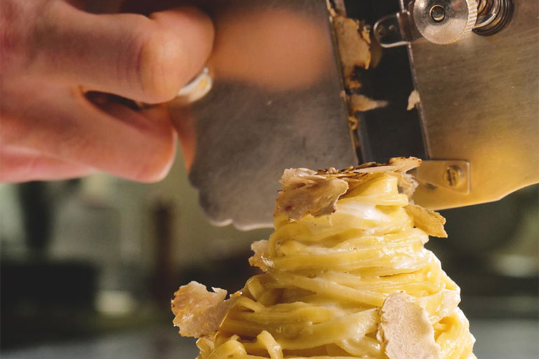 La regola principale è semplice: il tartufo bianco va utilizzato a crudo, affettato finemente direttamente sul piatto caldo. In questo modo il calore non lo cuoce, ma ne amplifica la fragranza, rendendo l’esperienza più intensa. È proprio così che, ad Alba, si serve la pasta durante la stagione: pochi ingredienti, massima qualità e un protagonista assoluto.